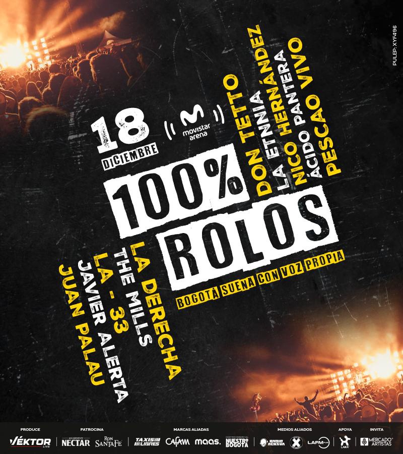 100% ROLOS: el concierto épico que marcará generaciones y será leyenda. Rock, salsa, urbano, popular, reggae, electro y más sorpresas se unen en una noche que hará historia. Cada boleta es tu voz para los que no tienen voz: con tu entrada donaremos 1 kilo de alimento para animales rescatados.